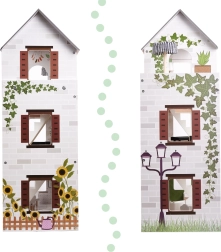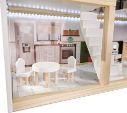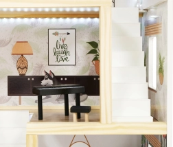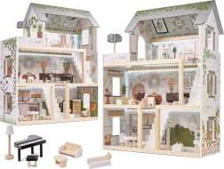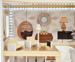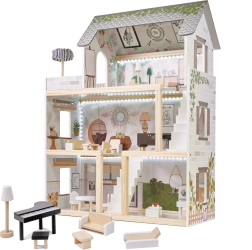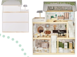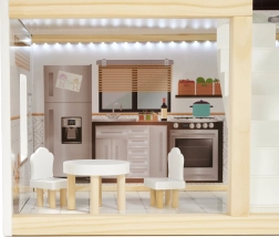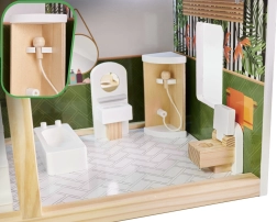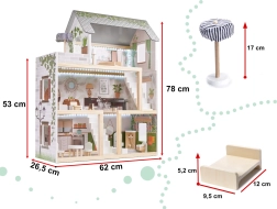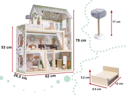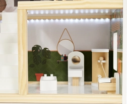 Drewniany domek dla lalek LULILO Floro został stworzony w stylu boho, dzięki czemu jest nie tylko piękny, ale i funkcjonalny. Dzięki trzem poziomom i przestronnemu tarasowi oferuje dużo miejsca na różnorodne scenariusze i zabawy. Domek wyposażony jest w cztery pomieszczenia: kuchnię, łazienkę, salon i sypialnię, z bogatym wyposażeniem jak w prawdziwym domu.