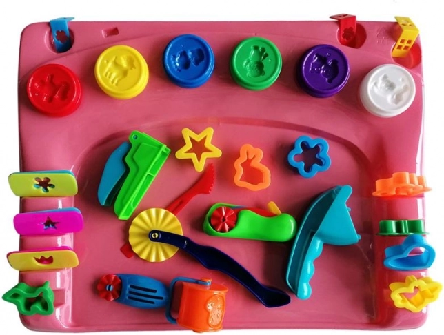 - 31 elementów akcesoriów, podkładka do modelowania, 6 kubeczków z masą plastyczną
