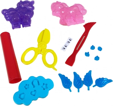- 3× kubeczek ciastoliny (50 g), 2× foremka do jednorożców, skrzydła i nóżki dla jednorożców, nożyczki, foremka do ozdabiania jednorożców, dodatkowe akcesoria