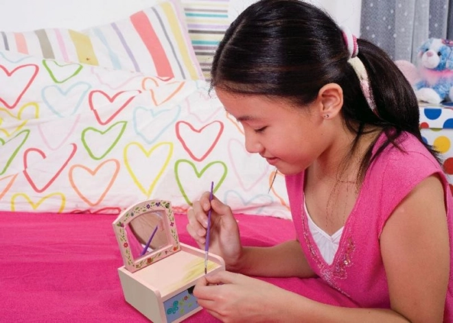 Odkryj radość tworzenia z tą wspaniałą kosmetyczną szkatułką. Ten zestaw pozwoli Ci pomalować i ozdobić własną szkatułkę na drobne skarby, idealną dla kreatywnych dzieci.