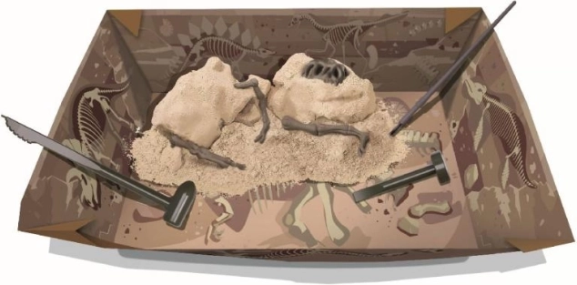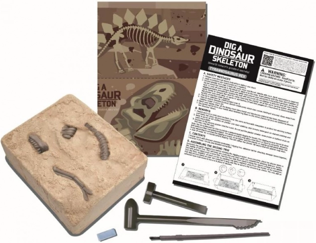 - Gipsowy blok z elementami szkieletu, narzędzia do wykopalisk (np. dłutko/rydło, pędzelek), instrukcja