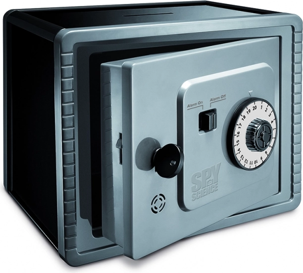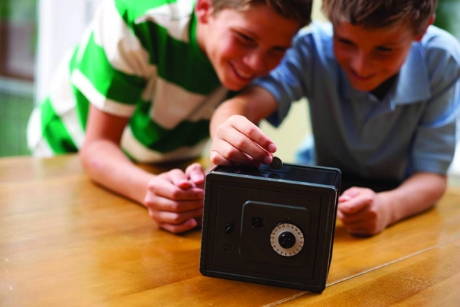 Bezpiecznie przechowuj swoje tajne skarby w sejfie z zamkiem szyfrowym. Za pomocą obrotowej tarczy ustawisz własny kod.