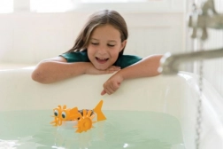 Lekki korpus i boczne łopatki zapewniają płynny ruch po powierzchni wody – w wannie, misce i dziecięcym baseniku.