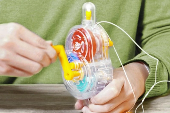 Obróć korbką i wytwórz prąd własną siłą. Przezroczyste korpus ukazuje pracę przekładni w czasie rzeczywistym.