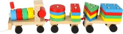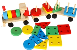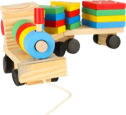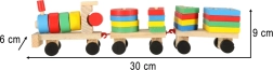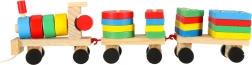 - Kompletny zestaw: lokomotywa + 2 wagoniki z zdejmowanymi klockami w 4 kolorach (żółty, czerwony, zielony, niebieski)