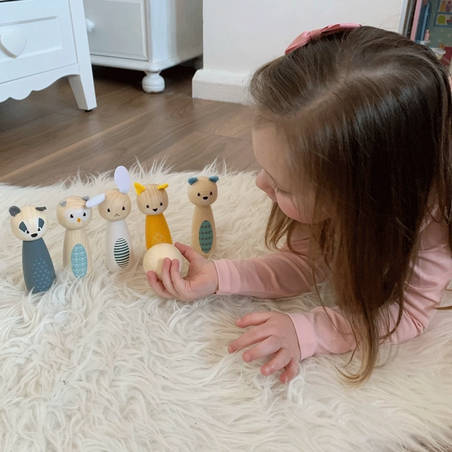 Spraw dzieciom radość stylowym zestawem kręgli z uroczymi zwierzątkami – sową, borsukiem, jeleniem, kotem, niedźwiedziem i królikiem. Kolorowe figurki z wysokiej jakości certyfikowanego drewna FSC są gładkie, przyjemne w dotyku i odporne na codzienną zabawę. Zestaw nadaje się do zabawy w domu – na dywanie i na gładkiej podłodze.