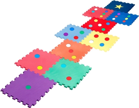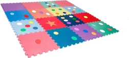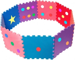 Żywe kolory i kształty (kropki, gwiazda) wspierają percepcję sensoryczną oraz rozwój małej i dużej motoryki. Pianka amortyzuje upadki i chroni przed chłodem podłogi.