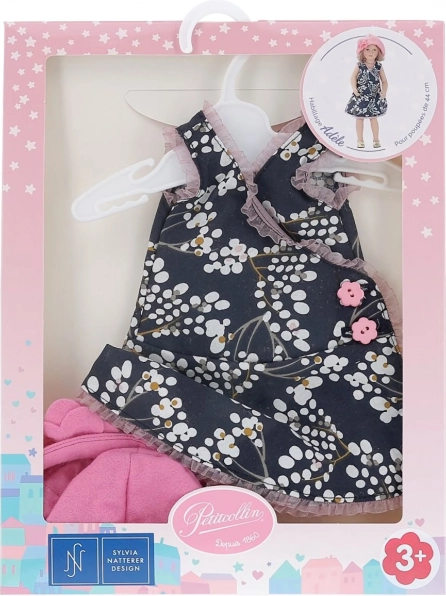 Ubranko zaprojektowane jest dla lalek o wysokości 44 cm, w szczególności dla serii Starlette. Połączenie granatowej sukienki w kwiaty i różowego kapelusika tworzy czarujący strój, który jest wygodny i bardzo fotogeniczny. Precyzyjne szycie i dbałość o detale podkreślają długą tradycję jakości marki PETITCOLLIN.