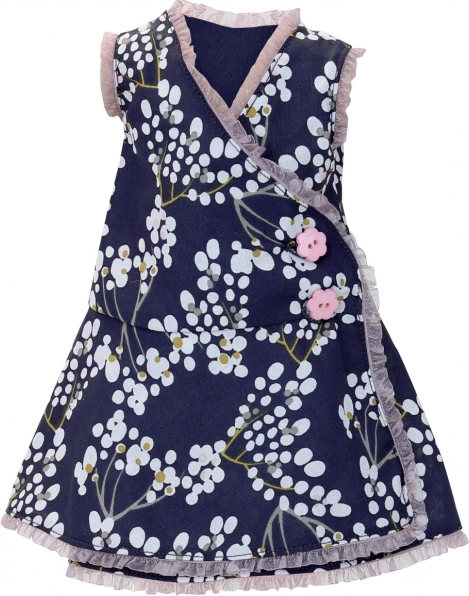 Granatowa sukienka z kwiatowym nadrukiem, dekoltem w kształcie V, ozdobnym obszyciem i różowymi guziczkami dodaje lalce szyku i elegancji.