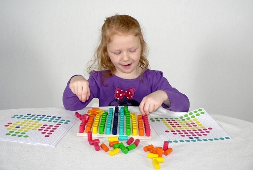Ta kolorowa mozaika motoryczna to idealna pomoc do rozwoju małej motoryki i logiki u dzieci od 3 lat. Dzieci wkładają kołeczki w otwory według wzorów lub własnej wyobraźni, ćwicząc cierpliwość, koncentrację i precyzję.