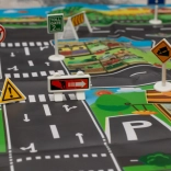 Zestaw zawiera różne znaki drogowe i naklejki, które pozwalają stworzyć własne miasto i nauczyć się podstawowych przepisów drogowych w zabawny sposób. Dziecko może cieszyć się odkrywaniem nowych historii i sytuacji na kolorowej planszy do zabawy.
