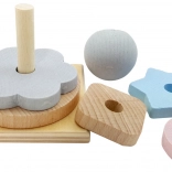 Klasyczna zabawka z pięcioma kształtami do układania i drewnianą kulą, idealna dla małych dziecięcych rączek. Dzięki swojemu kształtowi jest łatwa do chwytania i pomaga rozwijać koordynację oraz motorykę małą rąk.