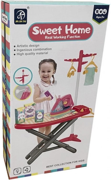 Zabawny zestaw dla małych gospodyń i gospodarzy zapewnia realistyczne prasowanie w bezpiecznej formie. Zawiera plastikową deskę do prasowania o wysokości 50 cm, żelazko ze światłem i efektami dźwiękowymi, wieszak, wieszaki ubraniowe i dodatki do kreatywnej zabawy w dom.