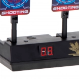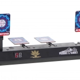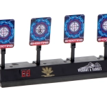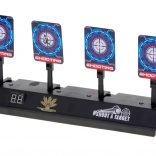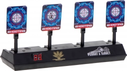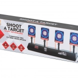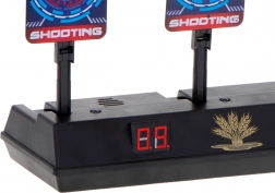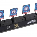 Wyświetlacz LED czytelnie zlicza punkty, a po trafieniu wszystkich czterech celów tarcze same się podnoszą – gra płynnie trwa bez ręcznego ustawiania.