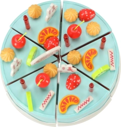 Sześć kawałków tortu jest połączonych rzepem – dzieci łatwo pokroją je plastikowym nożem i złożą z powrotem. Idealne do ćwiczenia małej motoryki i realistycznej zabawy.