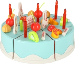 Ten kolorowy zestaw z niebieskim tortem urodzinowym idealnie nadaje się do zabaw w przyjęcie i do dziecięcej kuchni. Tort składa się z 6 kawałków łączonych rzepem, więc dzieci mogą kroić go dołączonym plastikowym nożem, przestawiać i ponownie ozdabiać. Bogate akcesoria – od świeczek i owoców po urocze króliczki i napis „Happy Birthday” – pobudzają kreatywność i rozwój wyobraźni.