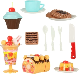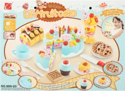 - Zawartość zestawu (75 szt.): 6× kawałek tortu, 5× świeczka, 14× bezy, 7× pałeczka cukrowa, 4× wisienka, 4× mandarynka, 3× truskawka, 3× kiwi, 4× króliczek, 1× napis, 3× talerzyk, 3× ciasteczko, 3× kawałek rolady, 3× babeczka, 1× filiżanka, 1× łyżeczka, 1× widelec, 1× nożyk, 1× łopatka do tortu, 1× pucharek do lodów, zestaw naklejek, zestaw rzepów.