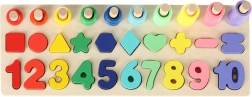 Ten zestaw Montessori łączy radość z układania z nauką. Dzieci dopasowują drewniane figury geometryczne i cyfry do odpowiednich otworów, a jednocześnie nakładają na kołki kolorowe krążki, których liczba odpowiada danej cyfrze. Dzięki przejrzystej drewnianej podstawie nauka jest naturalna i przyjemna.