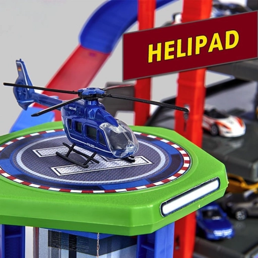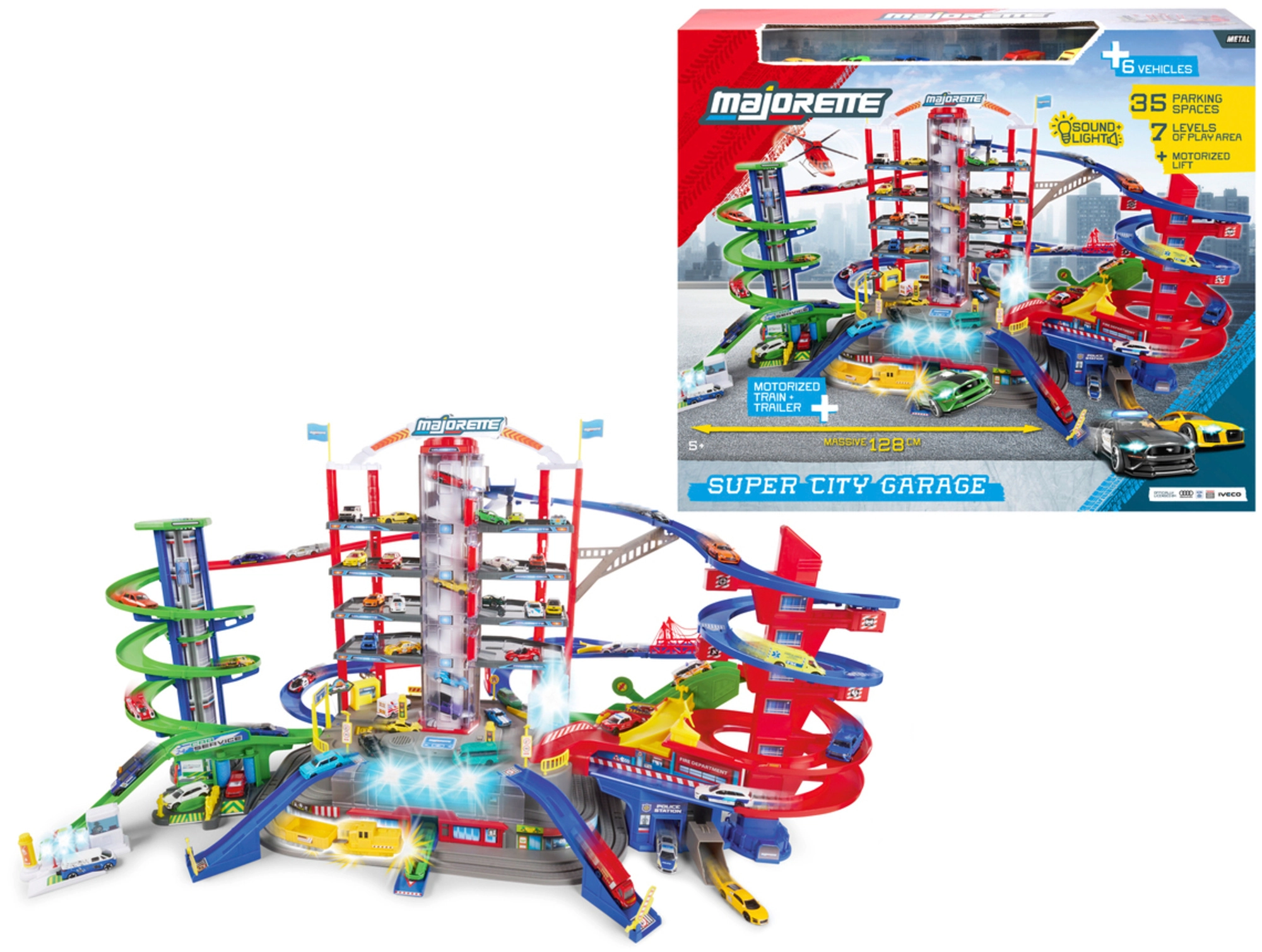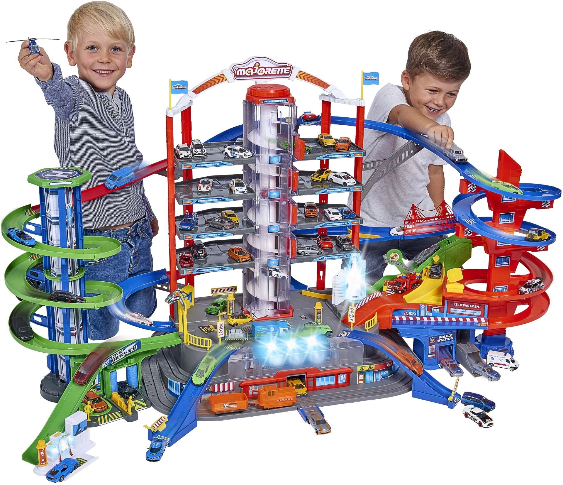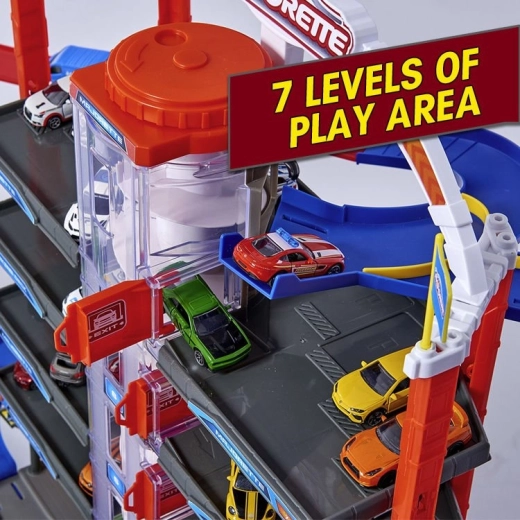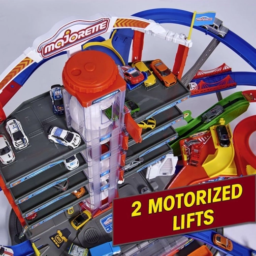 Rozległe strefy parkowania, wielopoziomowe tory i centralna wieża z windą zapewniają długie godziny zabawy i wyścigów.