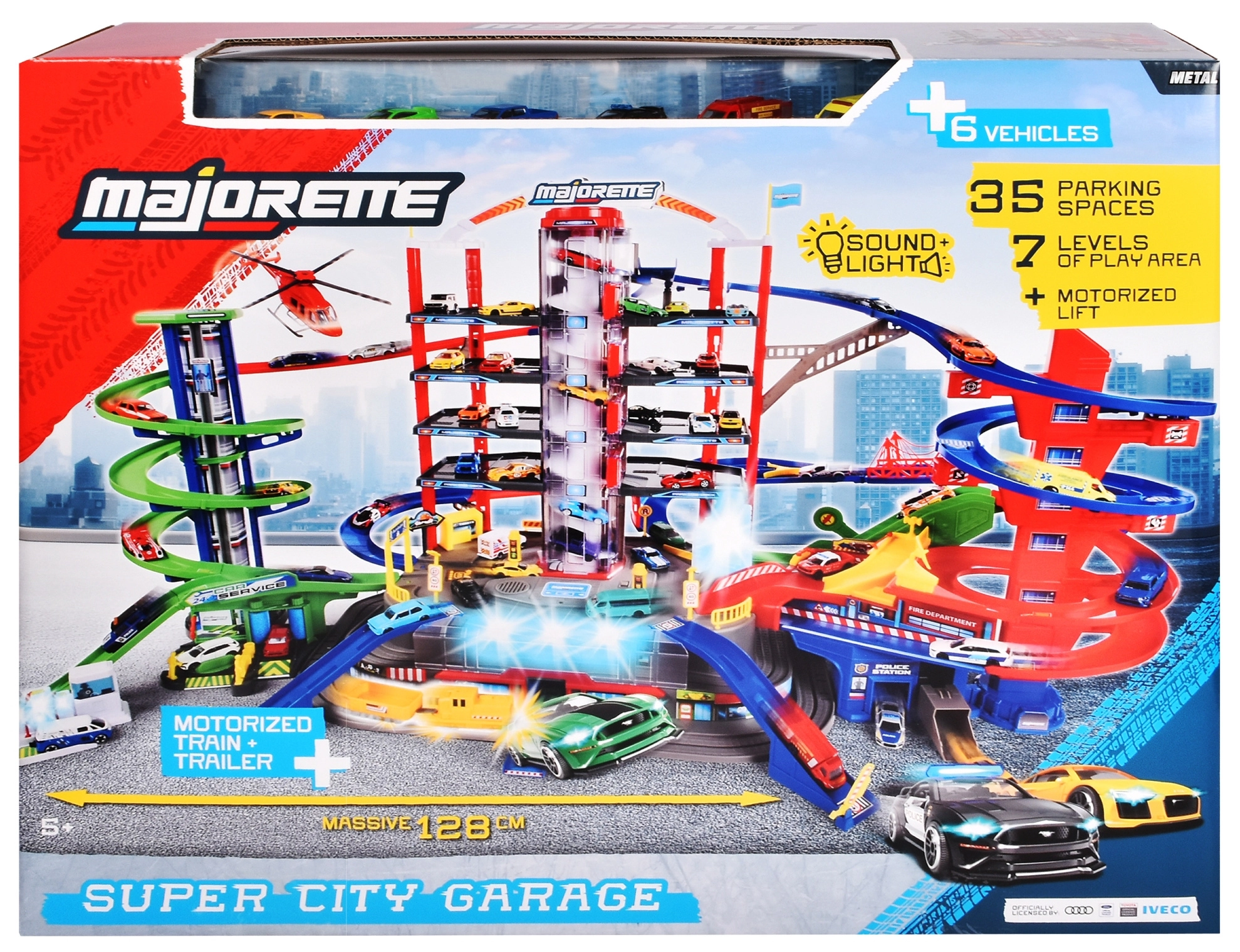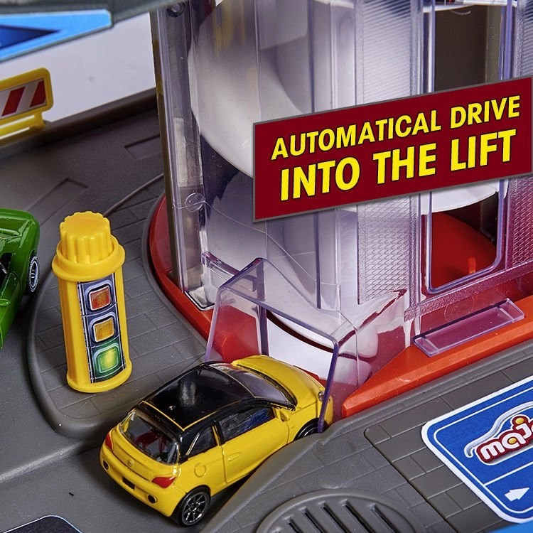 Ten duży zestaw garażowy oferuje dzieciom nieskończone możliwości zabawy na siedmiu poziomach. Kolorowe spiralne tory, winda zasilana bateriami oraz realistyczne efekty świetlne i dźwiękowe wciągną w akcję każdego małego miłośnika aut i pociągów. Metalowe autka z swobodnie toczącymi się kółkami poruszają się płynnie po rampach, a lokomotywa z wagonem przejeżdża przez tajemniczy tunel i zatrzymuje się na stacji kolejowej.
