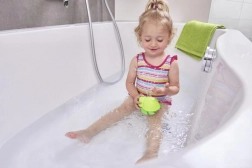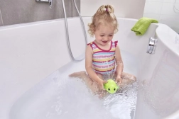 - Zabawa podczas kąpieli: pływa po powierzchni i tryska wodą.