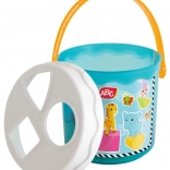 Wiaderko z pokrywką zawiera trzy różne otwory do sortowania według kształtu, dzięki czemu dzieci łatwo i przyjemnie uczą się rozpoznawać kształty.