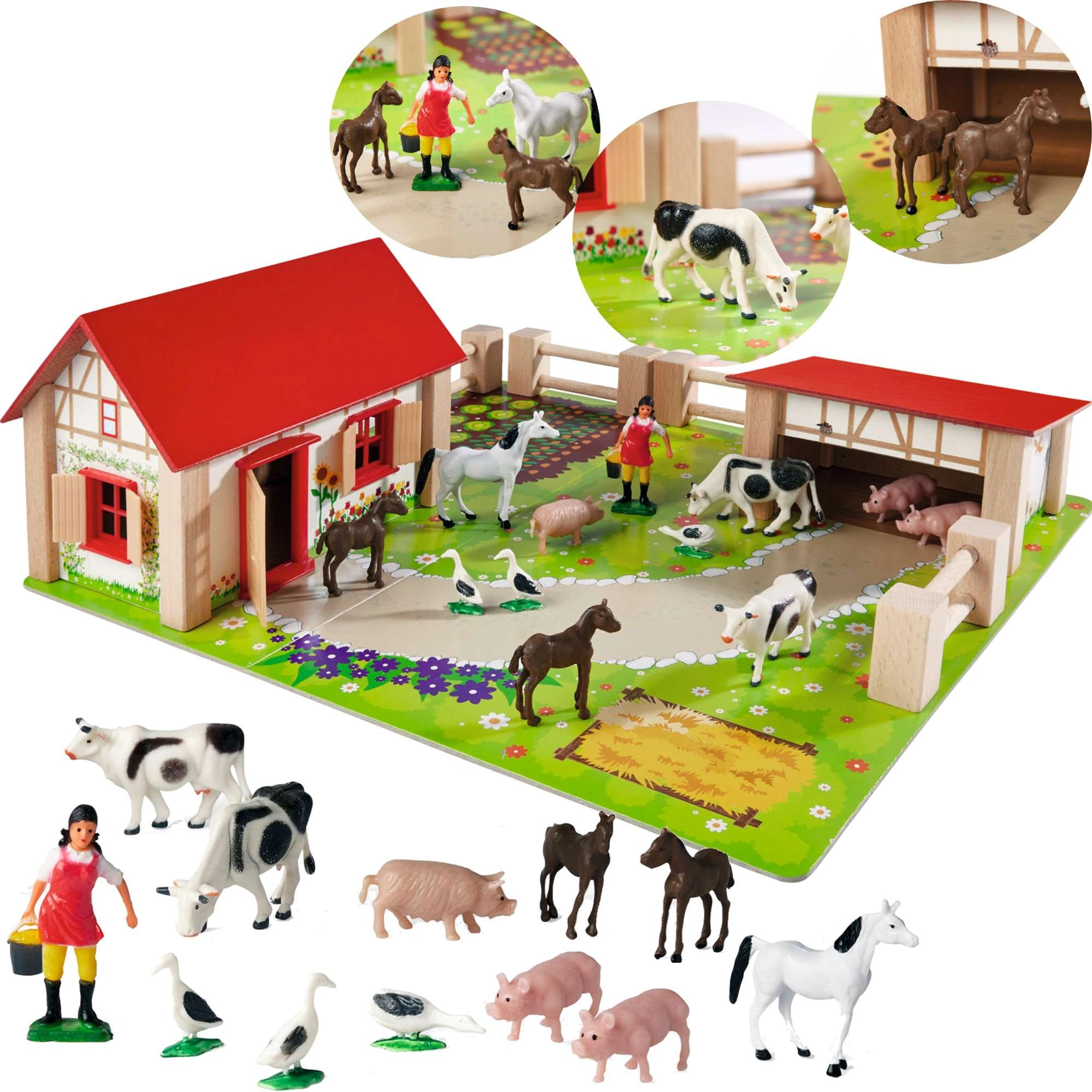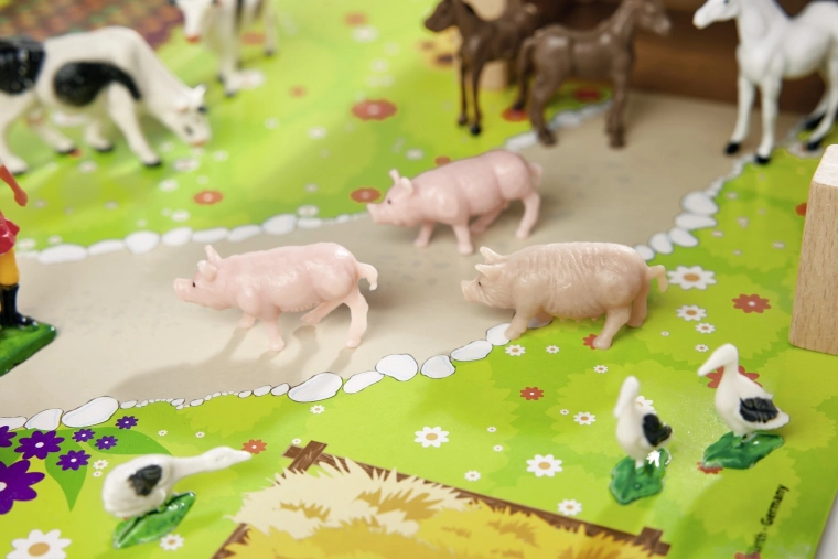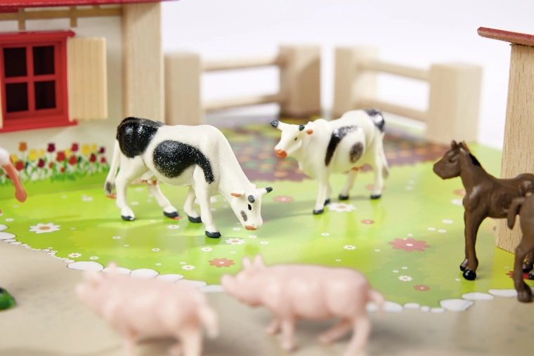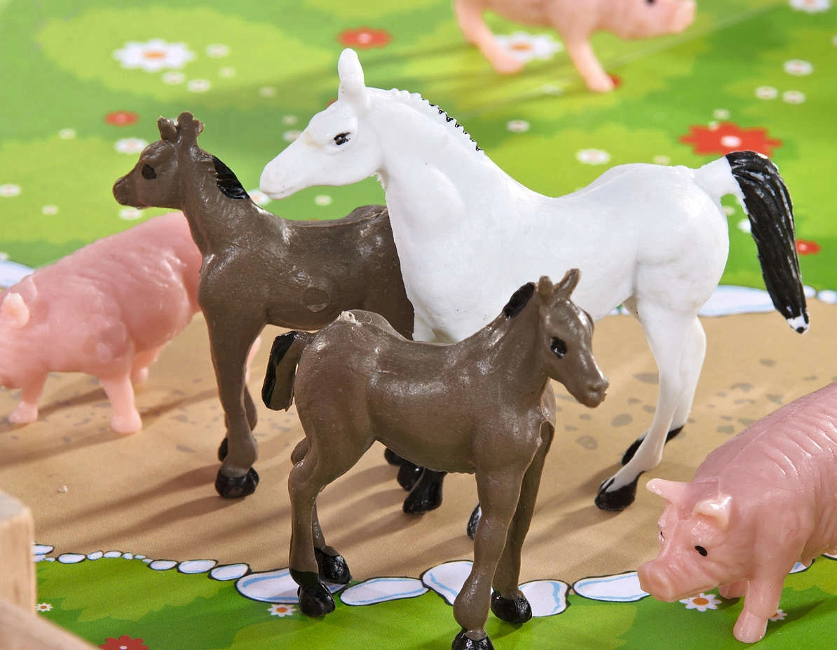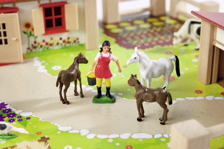 Konie, krowy, prosiaczki, gęsi oraz opiekunka pobudzają wyobraźnię, uczą dzieci rozpoznawania gatunków zwierząt i rozwijają umiejętności społeczne w ramach odgrywania ról.