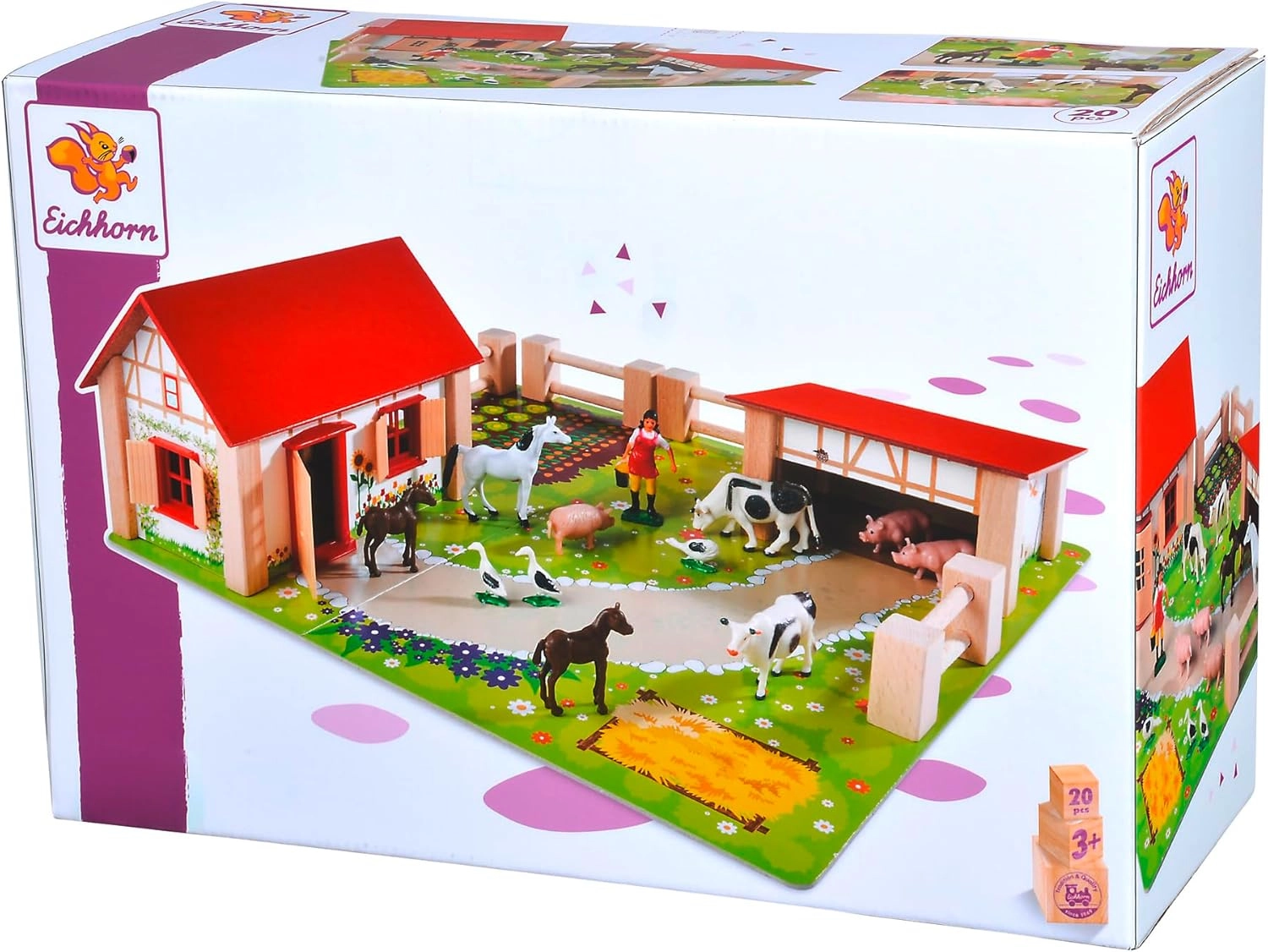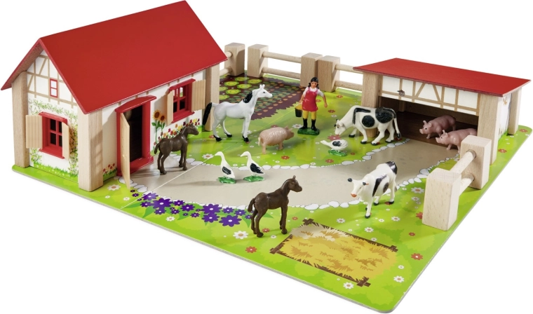 Drewniana farma EICHHORN ucieszy każdego małego gospodarza. Zestaw zawiera domek z czerwoną dachówką, stajnię, płotki oraz szczegółowe figurki zwierząt, w tym koniki, krówki, prosiaczki i gęsi. W komplecie znajduje się także kolorowa mata z drogami i ogródkiem, która w prosty sposób prowadzi dzieci do tworzenia własnych scen i opowieści. Solidna, drewniana konstrukcja i trwałe materiały zapewniają długą żywotność i bezpieczną zabawę.