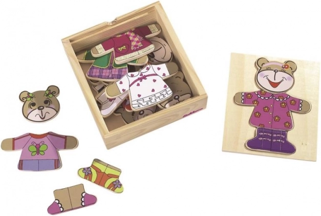 Ubierz swojego misia przy pomocy tej zabawnej układanki! Zawiera 20 części i przychodzi w praktycznym drewnianym pudełku.