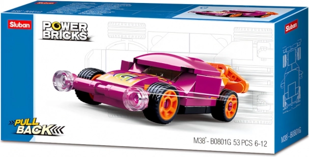 Fioletowy samochód na naciąg Sluban Power Bricks z 53 elementami. Kompatybilny z LEGO, COBI i Mega Bloks, wytrzymały plastik ABS, niski poziom trudności, dla dzieci od 6 lat.