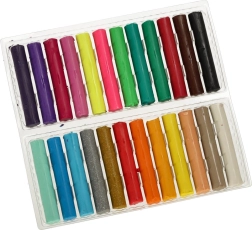 Zestaw zawiera 24 kolory z dwoma brokatowymi odcieniami: złotym i srebrnym. Każdy patyczek plasteliny waży 15 g, a dodatkowo otrzymujesz podkładkę ułatwiającą tworzenie. Wymiary opakowania to 19,5 cm x 17,5 cm x 1,5 cm.