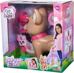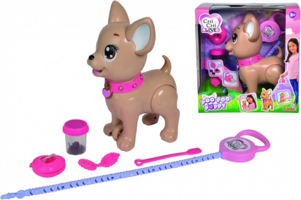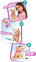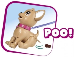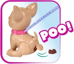 Interaktywny piesek chihuahua Poo Poo od CHI CHI LOVE zapewnia dzieciom realistyczną, a jednocześnie bezpieczną zabawę w opiekę nad pupilem. Uformuj smakołyk z masy plastycznej, nakarm pieska i wyrusz na spacer – po delikatnym naciśnięciu smyczy piesek ugnie tylne łapki i zrobi kupkę, którą można łatwo posprzątać za pomocą dołączonych woreczków.