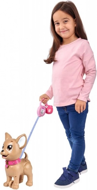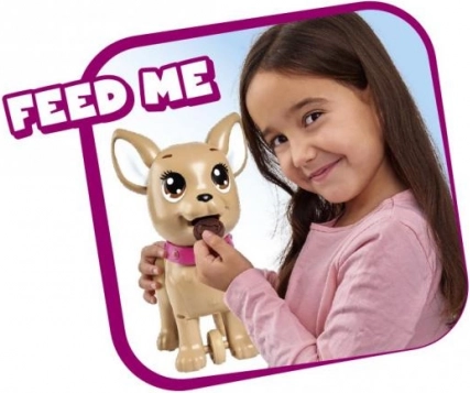 Uroczy interaktywny piesek chihuahua z kolekcji CHI CHI LOVE uczy dzieci opieki nad pupilem w zabawny sposób. Nakarm go masą plastyczną, wybierz się na spacer, a po lekkim naciśnięciu smyczy zrobi kupkę. W zestawie znajduje się smycz, masa plastyczna, foremka oraz pudełeczko w kształcie serca z woreczkami do łatwego sprzątania. Wielkość pieska to około 20 cm.
