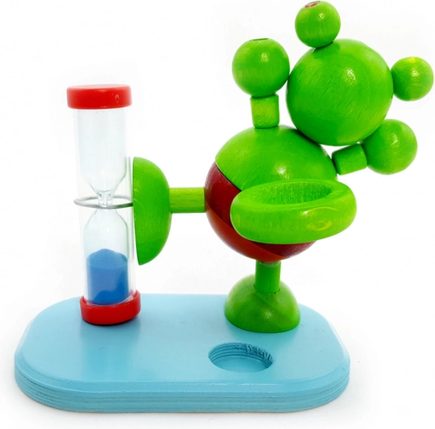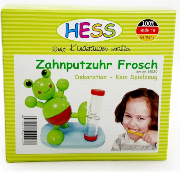 Umilcie dzieciom codzienną higienę dzięki tej wesołej drewnianej klepsydrze w kształcie żaby. Idealna do odmierzania 2 minut szczotkowania zębów, z praktycznym uchwytem na szczoteczkę do zębów za postacią żaby. Wysokiej jakości wykonanie z naturalnego, nieimpregnowanego drewna oraz atrakcyjny design motywują do regularnego mycia zębów.