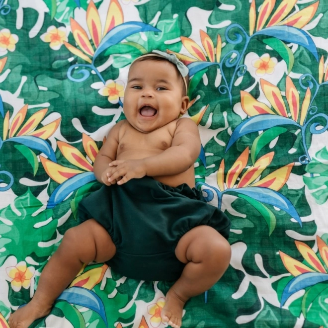 Lekka i puszysta bambusowo-bawełniana pieluszka muślinowa Tommy Lise we wzorze Lush Garden jest delikatna dla skóry dziecka, oddychająca, chłodząca i przyjemna w dotyku. Dzięki dużemu rozmiarowi 120 × 120 cm wykorzystasz ją jako kocyk, otulacz oraz osłonę podczas karmienia piersią.