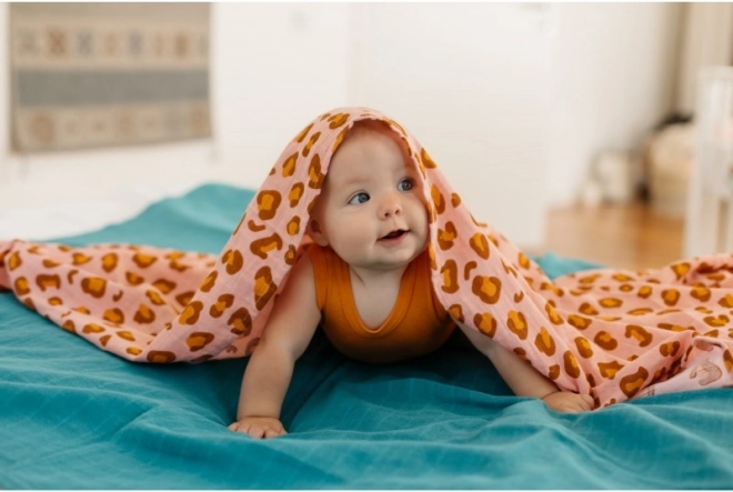 Hojny rozmiar 120 × 120 cm oferuje dziesiątki zastosowań: od otulania, przez okrycie w wózku, po śliniak czy podkład. Stylowy nadruk lamparta w koralowych tonach cieszy oko i pięknie komponuje się z dziecięcym pokoikiem oraz wyprawką w podróży.