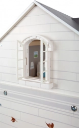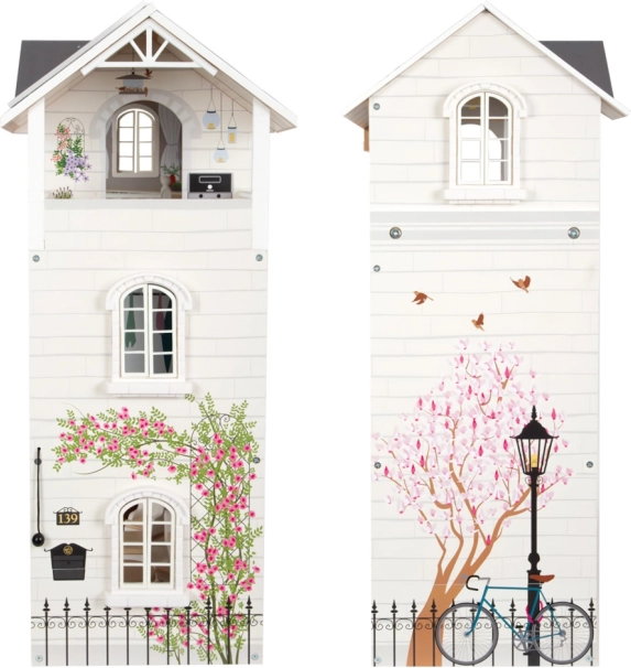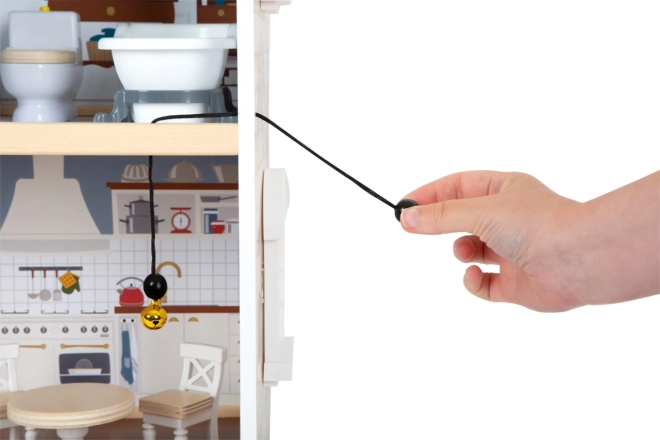 Domek dla lalek ma jasną zewnętrzną fasadę, nowoczesny design i funkcjonalne elementy, takie jak przesuwne drzwi i otwierane okna.