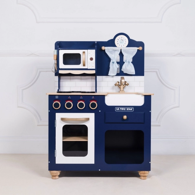 Stylowa dziecięca kuchnia z wysokiej jakości drewna w odcieniu królewskiego granatu ze złocistymi akcentami zapewnia dzieciom godziny kreatywnej i wyobrażeniowej zabawy. Oferuje otwierany piekarnik, obrotowe pokrętła, zlew, mikrofalówkę, urocze okienko z zasłonkami oraz zegar z ruchomymi wskazówkami. W zestawie znajdują się drewniane akcesoria – trzepaczka, łyżka kuchenna, solniczka i pieprzniczka. Wykonana etycznie z zrównoważonego drewna i malowana nietoksycznymi farbami na bazie wody.