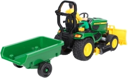 Traktorek jest wyposażony w przedni lemiesz do spychania liści lub śniegu oraz w zespół koszący, który wiernie symuluje koszenie trawy. Dzieci mogą łatwo odtwarzać prawdziwe prace w ogrodzie, rozwijając motorykę małą i wyobraźnię.