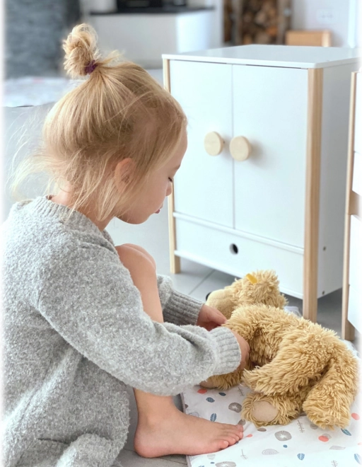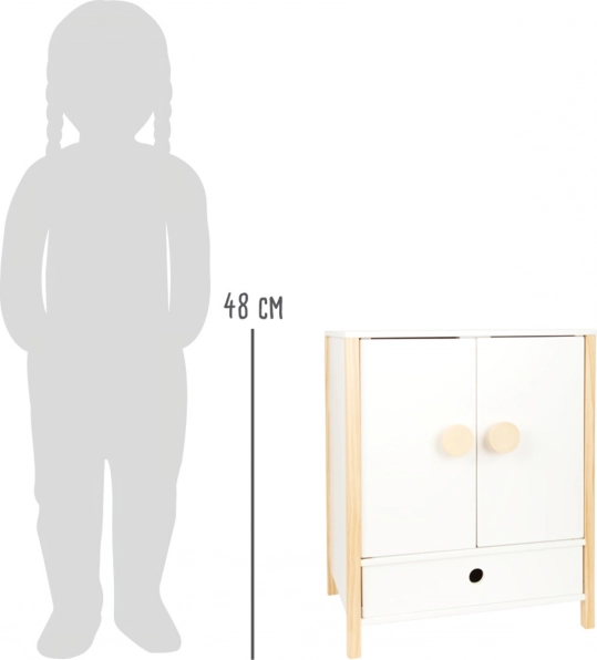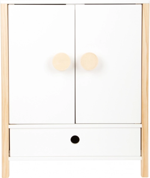 Trwała drewniana konstrukcja, stabilne wykonanie i bezpieczne, zaokrąglone krawędzie zapewniają wygodną i bezpieczną zabawę. Szafka wspiera samodzielność, poczucie porządku i rozwija wyobraźnię podczas zabawy w opiekę nad lalkami.
