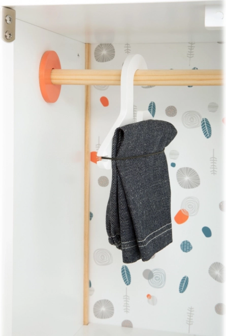 Drążek z wieszakami, wyjmowane półki i dolna szuflada utrzymają ubranka i akcesoria dla lalek zawsze czytelnie posegregowane.