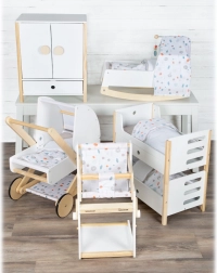 Kołysanie uspokoi każdą lalkę. W zestawie dwustronna pościel oraz duża kołdra odpowiednia dla lalek do 46 cm.