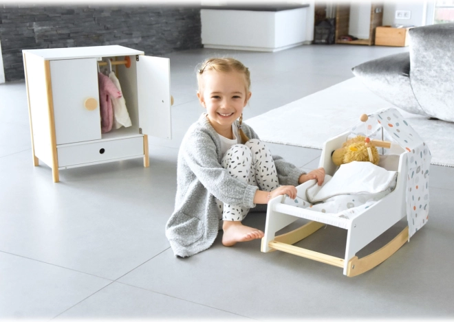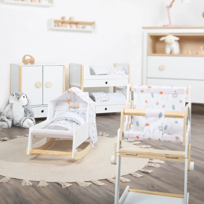 Stylowa kołyska dla lalek w stylu nordyckim dla dzieci od 3 lat. Oferuje stabilną drewnianą konstrukcję, płozy bujane, łatwo zdejmowany baldachim oraz dwustronną, neutralną płciowo pościel. Pod dużą kołdrą wygodnie wyśpią się lalki i pluszaki do 46 cm. Eleganckie pastelowe tony i zaokrąglone krawędzie doskonale wpasują się w nowoczesny pokój dziecięcy.