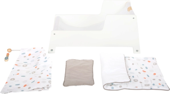 W zestawie znajduje się dwustronna, neutralnie stonowana pościel oraz duża kołdra, pod którą wygodnie zmieszczą się lalki lub pluszaki do 46 cm. Delikatne kolory i minimalistyczne linie czynią z niej gustowny dodatek do każdego wnętrza i wspierają kreatywną i naśladowczą zabawę.