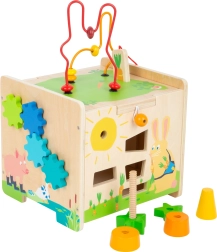 Ta wysokiej jakości drewniana kostka motoryczna z motywami króliczka i jego przyjaciół zachęca dzieci do odkrywania, trenuje koordynację oko–ręka i wspiera pierwsze doświadczenia muzyczne dzięki wbudowanemu ksylofonowi. Górną część z koralikowym labiryntem można łatwo zdjąć i odwrócić, aby kostka zajmowała mniej miejsca, ewentualnie wykorzystać ją praktycznie jako krzesełko.