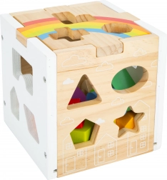 Ta nowoczesna drewniana wkładanka kostka SMALL FOOT wyróżnia się czystym wyglądem naturalnego drewna w połączeniu z białymi panelami i barwnymi elementami. Dzieci wkładają do otworów kształty takie jak koło, gwiazda, trójkąt, krzyż, chmurka czy domek, ćwicząc w zabawny sposób małą motorykę i logiczne myślenie.