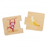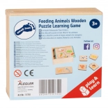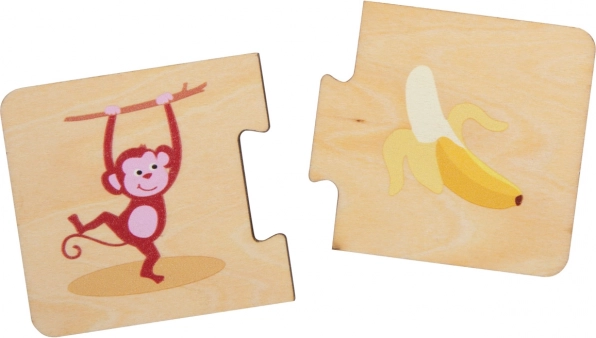 Ucz się i baw się z tą drewnianą grą logiczną, która nauczy twoje dziecko, jakie zwierzę co je. Puzzle, memory i gra w pary w jednym opakowaniu.