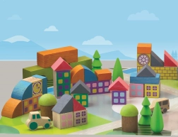 - 40 drewnianych klocków + mata do zabawy do budowy wioski