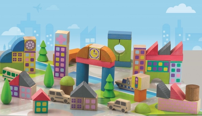 Ta wysokiej jakości drewniana układanka to idealny wybór na pierwsze projekty konstrukcyjne. Dzięki różnorodnym kształtom i kolorowym nadrukom dzieci z łatwością zbudują domki, ulice i całe miasteczko. W zestawie znajdują się także proste drewniane pojazdy oraz mata do zabawy, które dodają grze fabuły i wspierają rozwój wyobraźni.