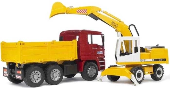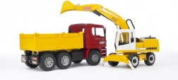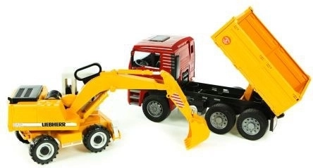 Ten wyjątkowy zestaw budowlany firmy Bruder obejmuje samochód ciężarowy MAN TGA z miękkimi oponami i praktyczną wywrotką. W komplecie znajduje się także funkcjonalna koparka Liebherr, która wyróżnia się stabilizującymi podporami, profilowanymi oponami oraz ramieniem z kabiną obracającą się o 360°. Produkt został starannie wykonany w Niemczech z trwałych materiałów.